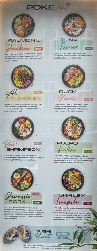 Poké Haus menu. Salmon L. Jackson, Tuna Turner, Al Pachicken, Duck Norris, Bart Shrimpson, Pulpo Fiction, Jurassic Pork, Shirley Tempeh. |